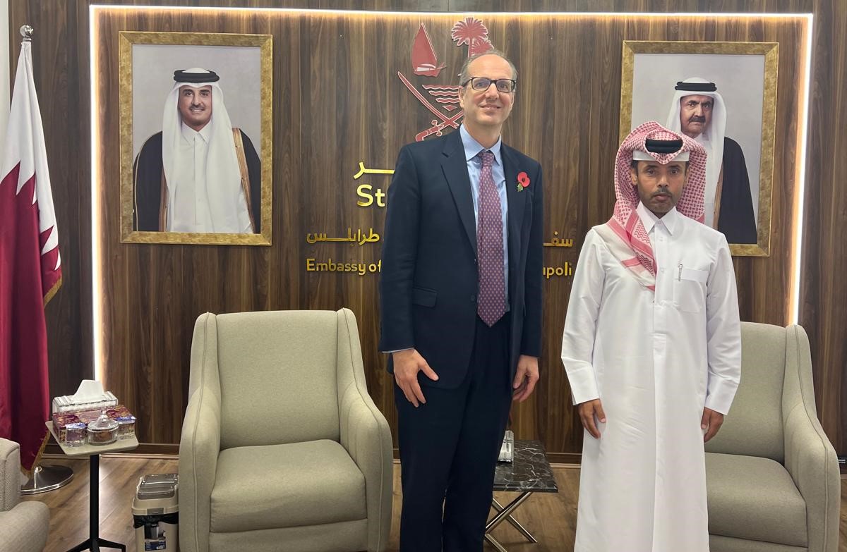 سفير دولة قطر يستقبل سفير المملكة المتحدة لدى ليبيا٠٣ نوفمبر ٢٠٢٥ استقبل سعادة الدكتور/ خالد محمد بن زابن الدوسري - سفير دولة قطر لدى ليبيا، سعادة السيد/ مارتن رينولدز- سفير المملكة المتحدة الجديد لدى ليبيا، وذلك بمناسبة استلام مهام عمله الجديد حيث رّحب سعادة السفير بسعادته مُتمنياً له التوفيق والنجاح.
